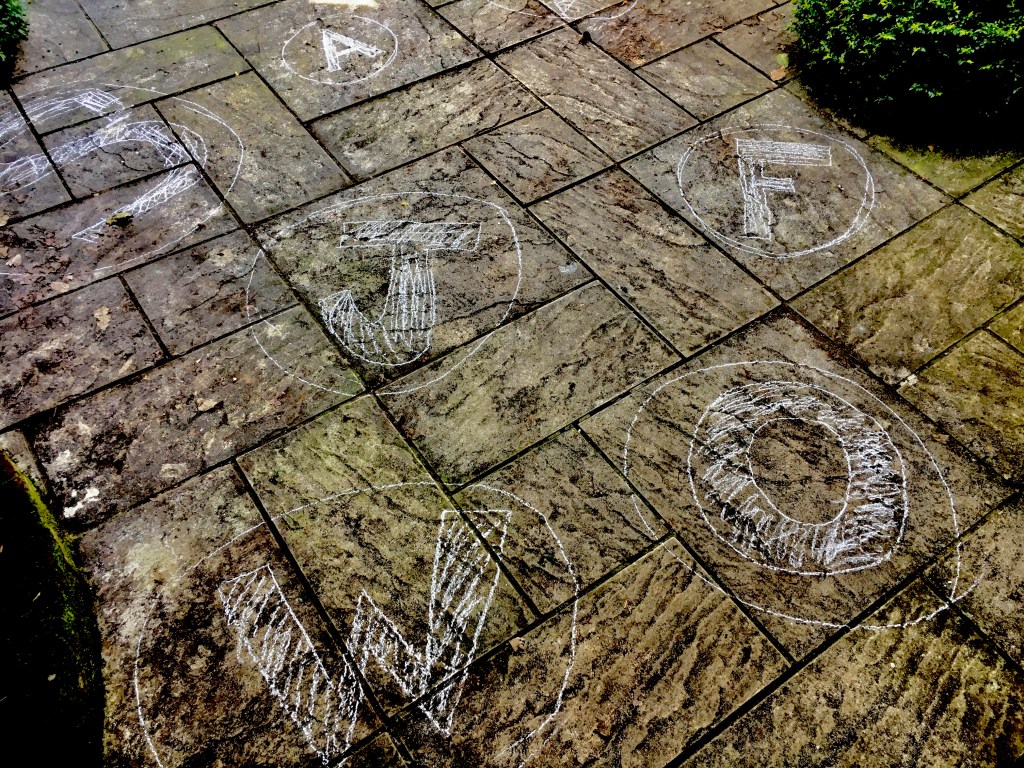 Cover the floor with the letters of the alphabet written in chalk. This doesn’t have to be the English alphabet. You can do it with any script.