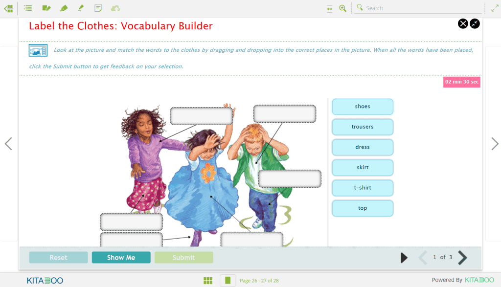 Alexandru tapped excitedly the different parts of the book and heard the narrative in Romanian and the different sounds of the illustration, scenes of a park full of children playing with their families. Slowly, he read some of the sentences in his first language and he heard the audio and me reading the same sentences in English, whilst he was pointing to the pictures and tapping to hear the different sounds. We moved on to the activities at the end, and we looked to the bilingual glossary with matching images from the book where we could both hear and read the words in both languages. Alexandru had the opportunity to learn some new English words, teach me some Romanian ones and correct my pronunciation and at the same time he felt happier, more relaxed and engaged. He also wrote some words in capital letters in his own language showing his writing ability, which seemed appropriate to his age and previous education. Alexandru also built his vocabulary further with different games when he labelled the parts of an image by dragging the correct word at the correct place and matching different pictures to words on the tablet and submitting his answers. This e-book enabled me to engage in an informal conversation with Alexandru, made both of us feel more at ease and get to know each other a little bit better while I had the opportunity to assess Alexandru’s first language (and partly English) listening, speaking, reading and writing skills.