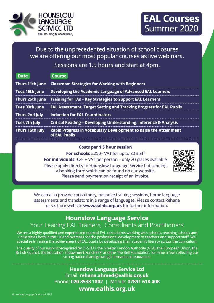 The latest edition of the EAL Journal was put together in challenging circumstances. Regrettably, in the upheaval and delay, we published advertisements from our friends at the EAL Academy and Hounslow Language Service that were incorrect and out of date. Reacting swiftly to the rapidly changing circumstances, these organisations had pulled out all the stops to transfer their usual in-person training online, ensuring that important EAL CPD could continue. We missed this, and apologise to both organisations for the confusion caused. We are happy to publish corrections here. Below is the revised programme of EAL professional development from Hounslow Language Service.