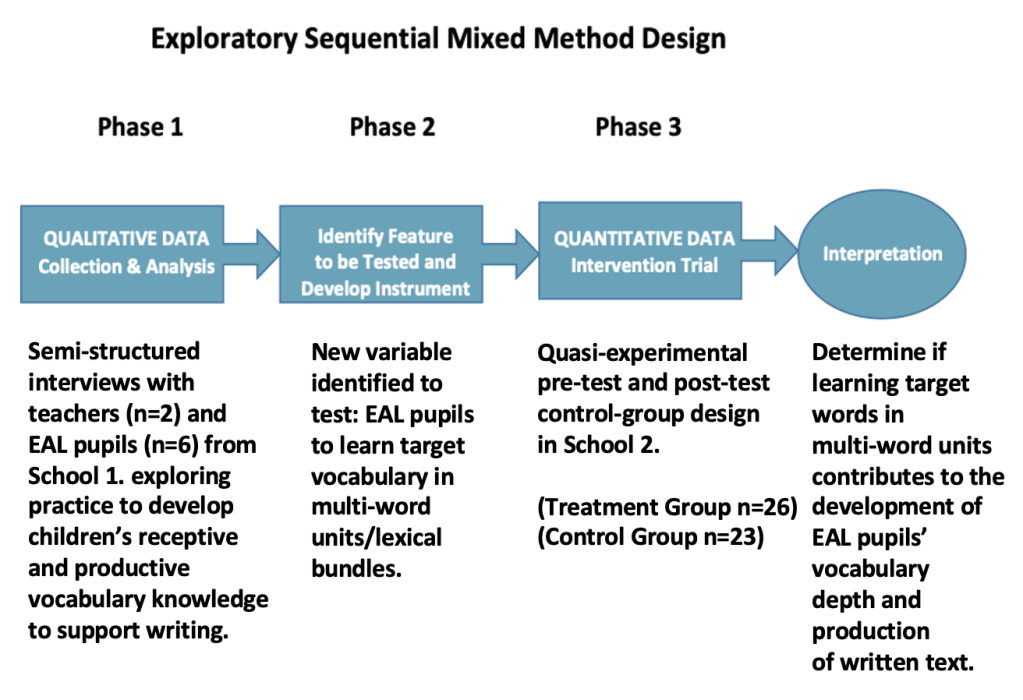 I chose a mixed method research design so that I could explore the perspectives of teachers and pupils, and cultural influences in real-life contexts. My study was conducted in three phases, each focusing on a different type of inquiry (see diagram below). First, I collected interview data so that I could learn about vocabulary development practices that teachers were actually using. Then, I used this information to identify a feature to be tested in an experiment. Finally, I tested the effectiveness of this feature. I did this by creating two groups of EAL learners with similar characteristics. In one group (26 pupils) the teacher taught new vocabulary by introducing words in isolation using a monolingual dictionary. The other group (23 pupils), were taught using multimodal approach, introducing new vocabulary in phrases, as well using dictionaries. All children were tested on how well they knew these words before and after the experiment. Receptive knowledge (knowing a word when you see or hear it) was tested using a multiple choice format test. Productive knowledge (remembering and using a word correctly) was tested by asking children to write descriptive sentences to accompany pictures and by asking them to provide the target words when presented with synonyms for them. Each group’s scores on these test were compared to see wether either teaching approach was more effective than the other.